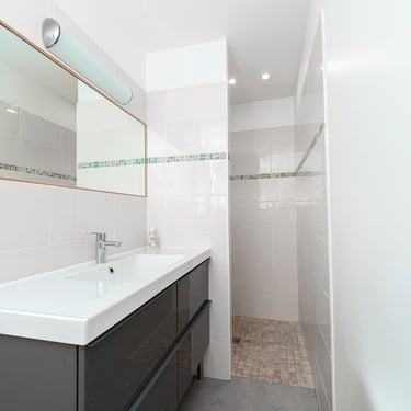 Salle de bain : vasque avec tiroirs, douche à l'italienne, sèche cheveux...