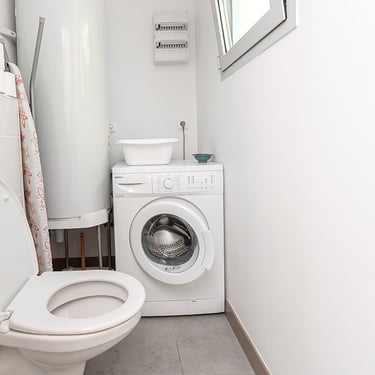 Chaise et lit pour bébé, lave linge, table et fer à repasser.